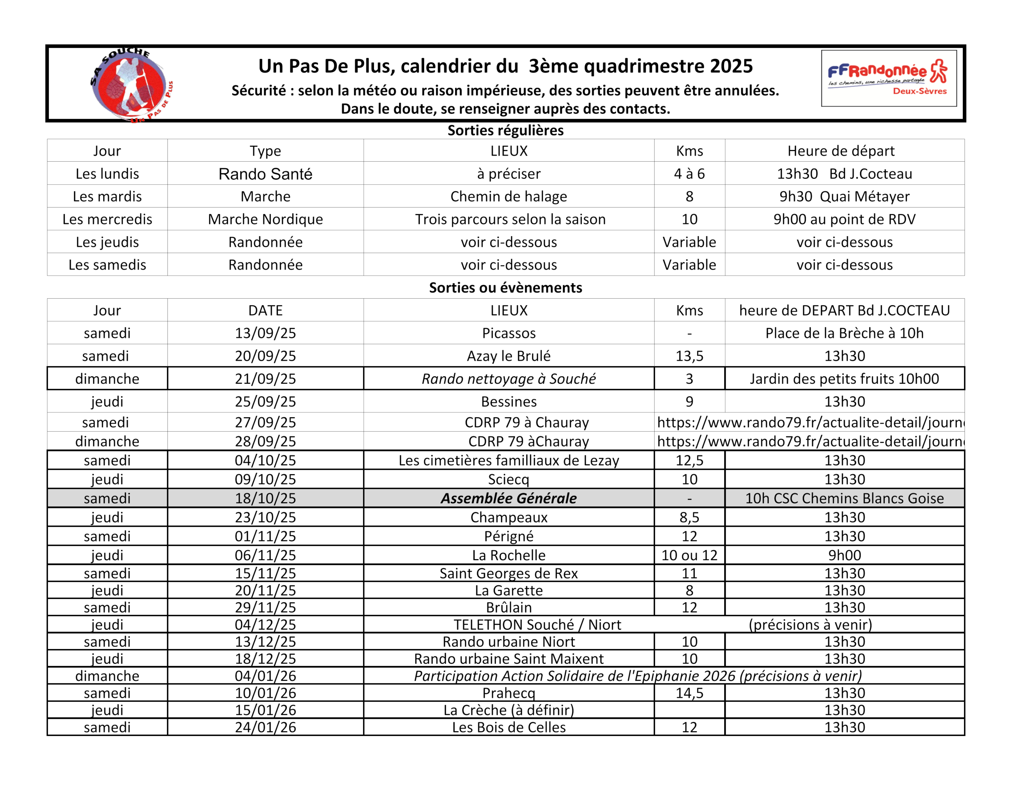 Consulter également la page Informations rubrique dernière minute pour prendre connaissance des dernières nouvelles ou modifications éventuelles concernant les randos.